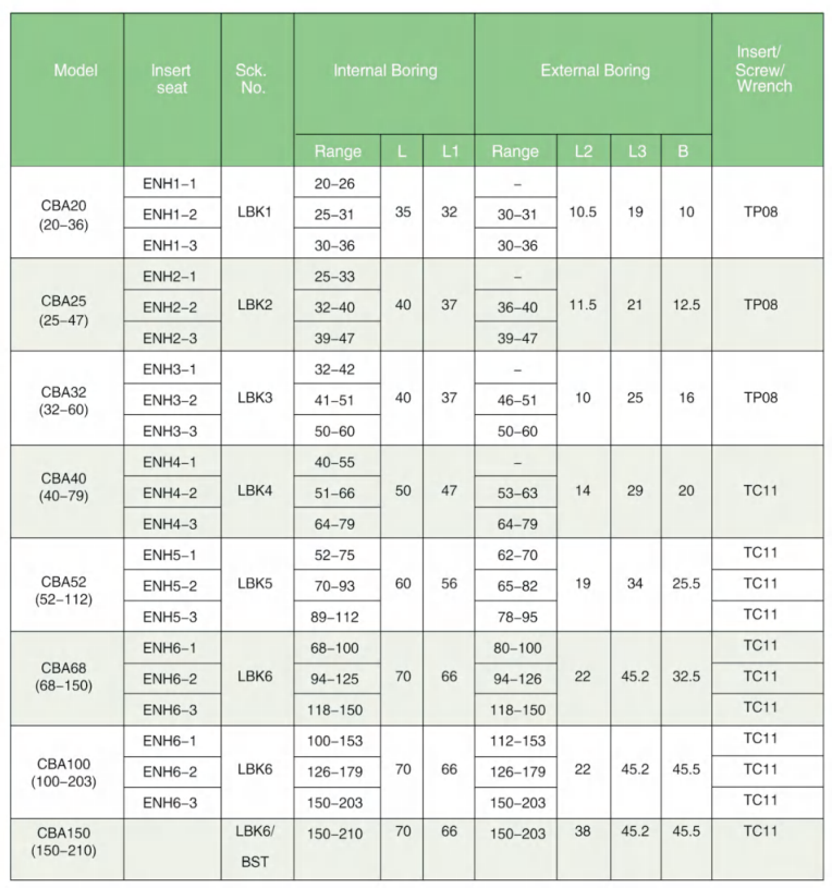 CBA (Cartridge Boring Adjustable) Micro Finish Boring Heads are precision tools designed for fine boring operations requiring exceptional surface finish and dimensional accuracy. These heads feature an adjustable cartridge system with interchangeable insert seats to cover a wide range of boring diameters. Key Features: • Cartridge System: Modular insert seat design (ENH series) for easy insert changes • Fine Boring: Optimized for precision finishing operations • Multiple Diameter Ranges: From 20mm to 210mm capacity • LBK Locking Blocks: Secure cartridge clamping systems (LBK1-LBK6, BST) • Adjustable Design: Fine-tune boring diameter within each range • High Rigidity: Stable construction for excellent surface finish Model Nomenclature: • **CBA**: Product series (Cartridge Boring Adjustable) • **20**: Minimum boring diameter (e.g., 20mm) • **(20-36)**: Complete boring range for that tool body • **ENH1-1**: Insert seat designation - **ENH**: Insert holder series - **1**: Insert size group (1-6) - **-1**: Range variant (1, 2, or 3) Insert Seat System: • **ENH1 Series**: Smallest inserts (for CBA20) • **ENH2 Series**: Small inserts (for CBA25) • **ENH3 Series**: Medium-small inserts (for CBA32) • **ENH4 Series**: Medium inserts (for CBA40) • **ENH5 Series**: Medium-large inserts (for CBA52) • **ENH6 Series**: Large inserts (for CBA68, CBA100, CBA150) Each CBA model supports 3 insert seats to cover its full diameter range: • **Variant -1**: Handles smallest diameters in the range • **Variant -2**: Handles middle diameters • **Variant -3**: Handles largest diameters Locking Block Systems: • **LBK1-LBK6**: Progressive sizes for different tool capacities • **BST**: Special system for largest model (CBA150) Applications: • Precision internal boring operations • Fine finishing of pre-drilled holes • High-accuracy diameter sizing • Surface finish improvement • Automotive and aerospace component finishing • Hydraulic cylinder boring • Bearing housing finishing Note: CBA = CBH (these designations are equivalent)