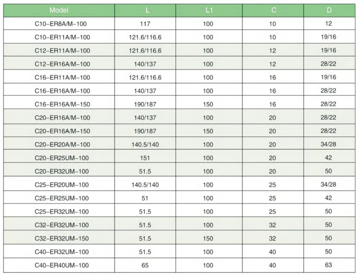 ER Collets Extension Bars - Extended Reach Solutions **TYPE: Extension bars for reaching deep cavities** AVAILABLE CONFIGURATIONS: ━━━━━━━━━━━━━━━━━━━━━━━━━━━━━━━━━━━━━━━━━━━━━━━━━━━━━━━━━━━━━━━━ C-Holder Input Sizes: C10, C12, C16, C20, C25, C32, C40 ER Collet Output: ER8, ER11, ER16, ER20, ER25, ER32, ER40 Extension Lengths (L1): 100mm, 150mm Types: A (standard), M (mini), UM (ultra mini) ━━━━━━━━━━━━━━━━━━━━━━━━━━━━━━━━━━━━━━━━━━━━━━━━━━━━━━━━━━━━━━━━ HOW EXTENSION BARS WORK: Extension bars have a C-shank (straight cylindrical) that mounts into a C-holder or side-lock chuck, and an ER collet output for your tool. ASSEMBLY SEQUENCE: 1. Mount C-holder/side-lock into your main tool holder (BT, SK, HSK) 2. Insert extension bar C-shank into C-holder 3. Lock with side screw 4. Insert ER collet into extension bar output 5. Insert cutting tool and tighten ER nut WHEN TO USE: ✓ Deep pocket milling ✓ Mold and die work ✓ Deep cavity finishing ✓ When standard holder length is insufficient ⚠️ IMPORTANT NOTES: • Use SHORTEST extension that provides clearance • Reduce speeds/feeds with longer extensions • Check runout increases with extension length • Maximum recommended total length depends on tool diameter WHAT FITS WITH WHAT: • C10 holder → ER8, ER11 output (very small tools) • C12 holder → ER8, ER11, ER16 output • C16 holder → ER11, ER16 output • C20 holder → ER16, ER20 output • C25 holder → ER20, ER25 output • C32 holder → ER25, ER32 output • C40 holder → ER32, ER40 output REQUIRED ACCESSORIES: • C-Holder or Side Lock Chuck (matching C size) • ER Collets (matching output size) • ER Nut • Main tool holder (BT, SK, HSK) 29 variants available | Price: €9.30 - €28.83