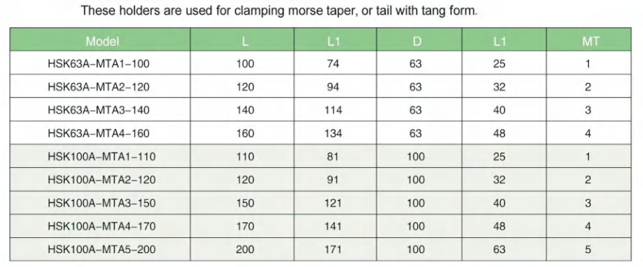 HSK-A-MTA Tool Holders are designed for holding morse taper tools or cutting tools with tang form. These holders provide secure clamping for morse taper shanks in CNC machining centers.