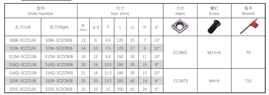 The Internal-SCZC Internal Turning Tool is engineered for internal boring operations on both CNC and conventional lathe machines. Featuring 80° diamond positive inserts (ISO designation CC.. 0602..), this versatile tool holder provides exceptional stability and precision for various machining applications.