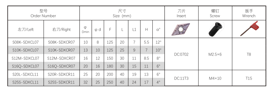 The Internal-SDXC Internal Turning Tool is engineered for internal turning operations on both CNC and conventional lathe machines. Featuring 55° diamond positive inserts (ISO designation DC.. 0702..), this versatile tool holder provides exceptional stability and precision for various machining applications.