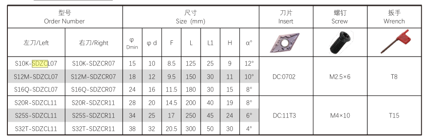 The Internal-SDZC Internal Turning Tool is engineered for internal boring and turning on both CNC and conventional lathe machines. Featuring 55° diamond positive inserts (ISO designation DC.. 0702..), this versatile tool holder provides exceptional stability and precision for various machining applications.