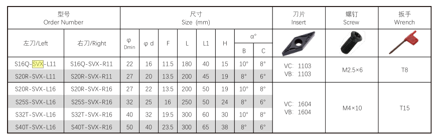 The Internal-SVX Internal Turning Tool is engineered for internal turning and finishing on both CNC and conventional lathe machines. Featuring 35° diamond positive inserts (ISO designation VC/VB.. 1103..), this versatile tool holder provides exceptional stability and precision for various machining applications.