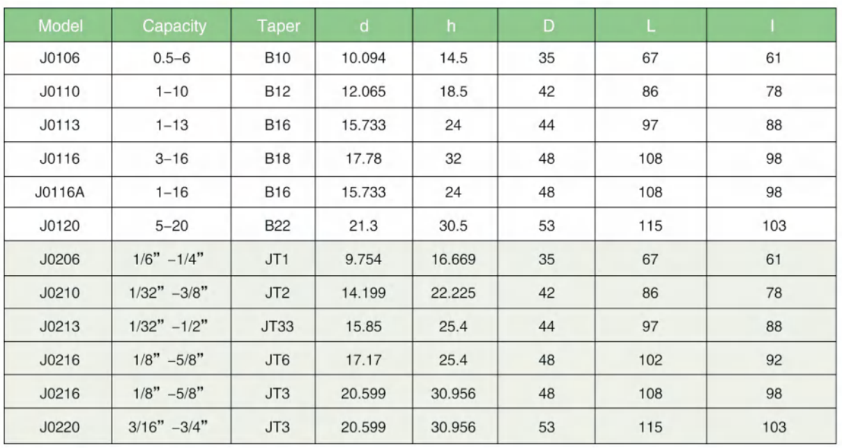 Keyless Drill Chucks provide quick and easy drill bit changes without the need for a chuck key. Featuring high-precision construction with hardened steel jaws for secure clamping and excellent concentricity. Available in both Morse Taper (B10-B22) and Jacobs Taper (JT1-JT33) configurations to match your spindle, with various clamping ranges for different drill bit sizes. Each configuration is available in 6 different variations (A-F) to suit different requirements.