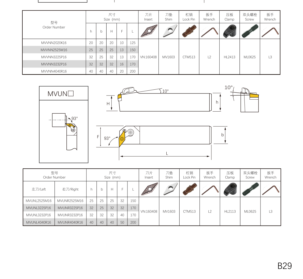 The MVUN External Turning Tool is designed for external turning and finishing on both CNC and conventional lathe machines. Utilizing 35° diamond negative inserts (ISO designation VN..), this robust tool holder provides exceptional stability and precision for diverse machining applications.