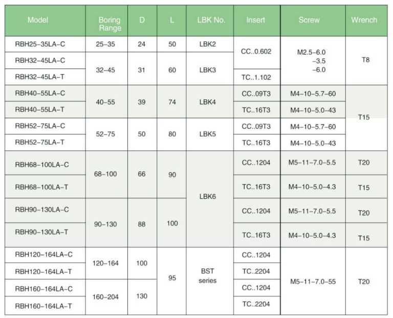 RBH Indexable Twin-bit Rough Boring Heads are specialized tools designed for rough boring operations in large diameter applications. These heads feature twin cutting inserts for balanced cutting forces and enhanced productivity in heavy roughing cuts. Key Features: • Twin-bit Design: Two cutting inserts for balanced cutting forces and reduced vibration • Indexable Inserts: Quick insert changes without removing the head from machine • Multiple Boring Ranges: From 25mm to 204mm diameter capacity • Two Insert Types: C-type (CC series - 80° diamond) and T-type (TC series - triangular) • LBK Locking Blocks: Secure insert clamping systems (LBK2-LBK6, BST series) • Various Shank Diameters: From 24mm to 130mm for different applications • High Rigidity: Robust construction for stable boring operations Model Nomenclature: • **RBH**: Product series (Rough Boring Head) • **25-35**: Boring diameter range (25mm min to 35mm max) • **LA**: Insert locking mechanism/head design type • **C/T**: Insert type designation - **C**: Uses CC-series inserts (CCMT/CCGT style - 80° diamond inserts) - **T**: Uses TC-series inserts (TCMT/TCGT style - triangular inserts) Insert Types: • **C-Type (CC Series)**: 80° diamond shaped inserts for general boring operations • **T-Type (TC Series)**: Triangular inserts for specific boring applications Applications: • Large diameter rough boring operations • Heavy material removal in boring • Pre-machining before finish boring • Cast iron and steel boring • Production machining with high metal removal rates • Automotive and aerospace component manufacturing
